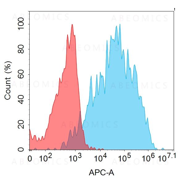 Figure 1. Flow cytometry analysis with 1μg/mL Anti-CD20 (1F2) mAb on Expi293 cells transfected with human CD20 (Blue histogram) or Expi293 transfected with irrelevant protein (Red histogram).