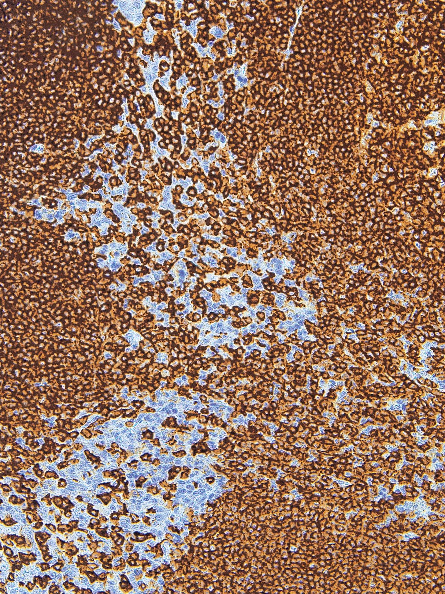 Cluster of Differentiation (CD20), also known as B-Lymphocyte Antigen, is a non-glycosylated protein expressed on the surface of normal and malignant B-cells, which functions in chemokine signaling and microenvironmental interactions of B-cells. Anti-CD20 stains a minority of Reed-Sternberg cells with Hodgkin's disease. Since CD20 does not stain T-cell malignancies, it is a very useful marker for B-cell lymphomas. CD20 is also not reactive on non-hematopoietic neoplasms.