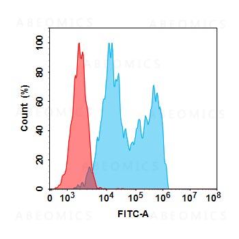Figure 1. Flow cytometry analysis with 2 μg/mL Anti-CD20 (obinutuzumab biosimilar) mAb on Expi293 cells transfected with Human CD20 protein (Blue histogram) or Expi293 transfected with irrelevant protein (Red histogram).