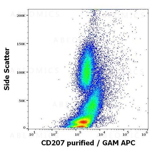 Figure 1: Flow cytometry intracellular staining pattern of human stimulated (GM-CSF + IL-4 + TGF-beta) peripheral blood mononuclear cells whole blood stained using anti-human CD207 (2G3) purified antibody (concentration in sample 0.56 μg/ml, GAM APC).