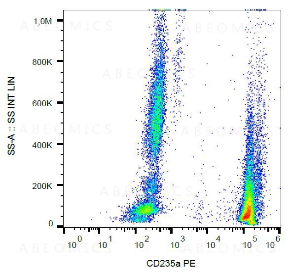 Figure 1: Surface staining of CD235a in human peripheral blood (erythrocytes and leukocytes) with anti-CD235a (JC159) PE.