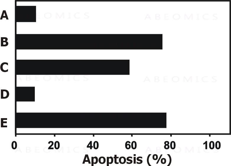 Figure 1: Apoptosis induced in JURKAT human T cell leukemia cell line by soluble recombinant human TRAIL is completely blocked by anti-human TRAIL (2E5).The neutralizing activity of the antibody 2E5 has been confirmed with various sources of soluble recombinant human TRAIL.A - mediumB - recombinant TRAILC - recombinant TRAIL + anti-human TRAIL (2E5; 0.06 µg/ml)D - recombinant TRAIL + anti-human TRAIL (2E5; 0.24 µg/ml) E - recombinant TRAIL + Isotype mouse IgG1 control