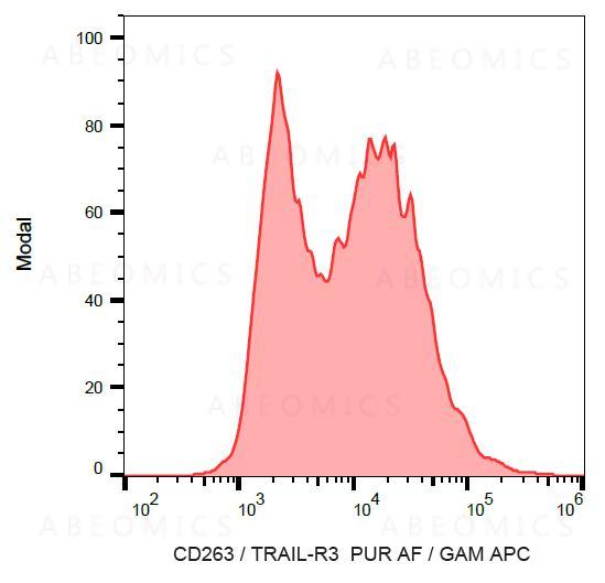 TRAIL-R3 (CD263, TR3, DcR1, LIT, TRID), expressed mainly on neutrophils, belongs to receptors of TRAIL, a TNF-like membrane cytotoxic protein that induces apoptosis in many tumour cells, but not in normal cells. TRAIL-R3, however, is a GPI-anchored protein that lacks cytoplasmic death domain, thus it is unable to induce apoptosis and serves as a negative regulator of apoptotic signaling by competing for binding of TRAIL with death receptor 5 (DR5).