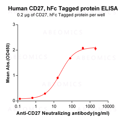 Figure-1: ELISA plate pre-coated by 2 μg/ml (100 μl/well) Human CD27, hFc tagged protein can bind Anti-CD27 Neutralizing antibody in a linear range of 3.2-80.0 ng/ml.