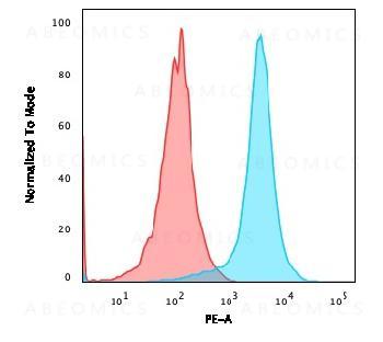 Fig. 1: Flow Cytometric Analysis of Jurkat cells using PE conjµgated CD31 Mouse Monoclonal Antibody (JC/70A) Isotype Control (Red).