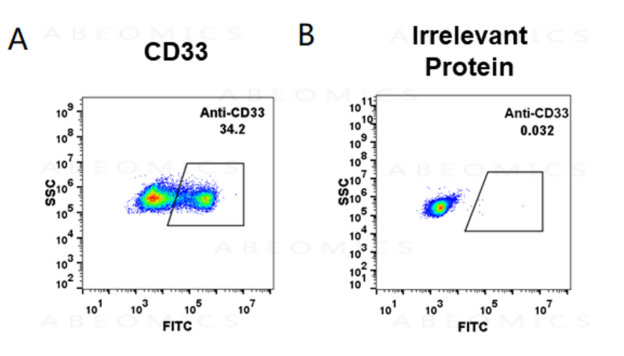 Figure-1: HEK293 cell line transfected with irrelevant protein (B) and human CD33 (A) were surface stained with anti-CD33 neutralizing antibody 1μg/ml (gemtuzumab ozogamicin) followed by Alexa 488-conjugated anti-rabbit IgG secondary antibody.
