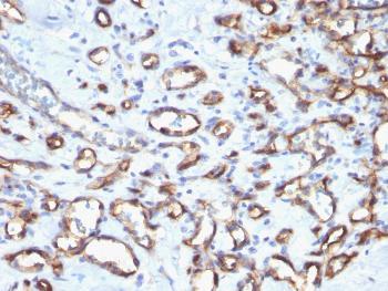 Fig. 1: Formalin-fixed, paraffin-embedded human Angiosarcoma stained with CD34 Rabbit Polyclonal Antibody.