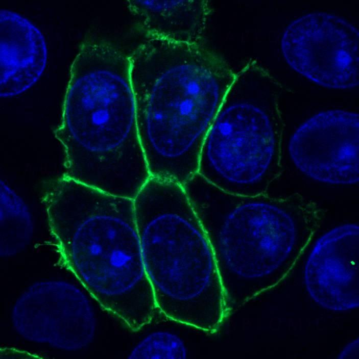 Figure 1: Detection of DR6 transiently transfected into HeLa cells (green) using anti-DR6 antibody (DR-6-04-EC). Cell nuclei visualized by DAPI (blue).
