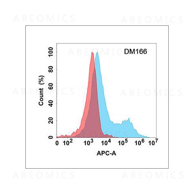 Figure 1. Flow cytometry analysis with Anti-CD37 (DM166) on Expi293 cells transfected with human CD37 (Blue histogram) or Expi293 transfected with irrelevant protein (Red histogram).