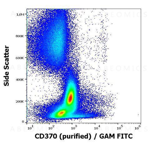 Figure 1 : Flow cytometry surface staining pattern of human peripheral whole blood stained using anti-human CD370 (8F9) purified antibody (concentration in sample 1,67 µg/ml) GAM FITC.