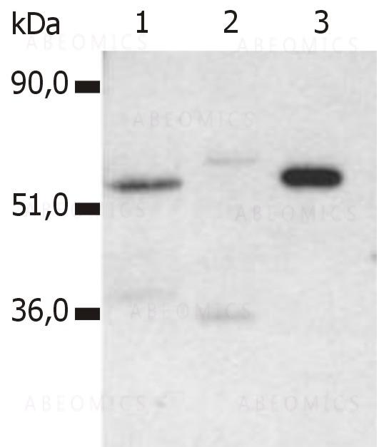 Figure 1: Immunoprecipitation of human CD4 fromthe lysate T cells isolated from fresh buffy coats.Western blot was immunostained by anti-humanCD4 (MEM-241; ). Lane 1: original lysate of T cells. Lane 2: immunoprecipitate by negative control antibody. Lane 3: immunoprecipitate by anti-human CD4 (MEM-115)
