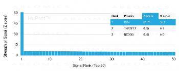 Fig. 1: Analysis of Protein Array containing more than 19,000 full-length human proteins using CD4 Mouse Monoclonal Antibody (CD4/3027). Z- and S- Score: The Z-score represents the strength of a signal that a monoclonal antibody (Monoclonal Antibody) (in combination with a fluorescently-tagged anti-IgG secondary antibody) produces when binding to a particular protein on the HuProtTM array. Z-scores are described in units of standard deviations (SD’s) above the mean value of all signals generated on that array. If targets on HuProtTM are arranged in descending order of the Z-score, the S-score is the difference (also in units of SD’s) between the Z-score. S-score therefore represents the relative target specificity of a Monoclonal Antibody to its intended target. A Monoclonal Antibody is considered to specific to its intended target, if the Monoclonal Antibody has an S-score of at least 2.5. For example, if a Monoclonal Antibody binds to protein X with a Z-score of 43 and to protein Y with a Z-score of 14, then the S-score for the binding of that Monoclonal Antibody to protein X is equal to 29.