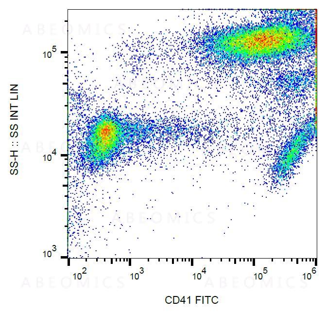 CD41 (platelet glycoprotein IIb) is composed of two subunits (120 kDa a, alpha and 23 kDa b, beta) that interact with CD61 in the presence of calcium to form a functional adhesive protein receptor. Upon blood vessel damage, this receptor binds to a variety of proteins including von Willebrand factor, fibrinogen, fibronectin and vitronectin. CD41 is mainly expressed on megakaryocyte-platelet lineage, but generally belongs to the antigens that are expressed during early stages of hematopoietic differentiation.