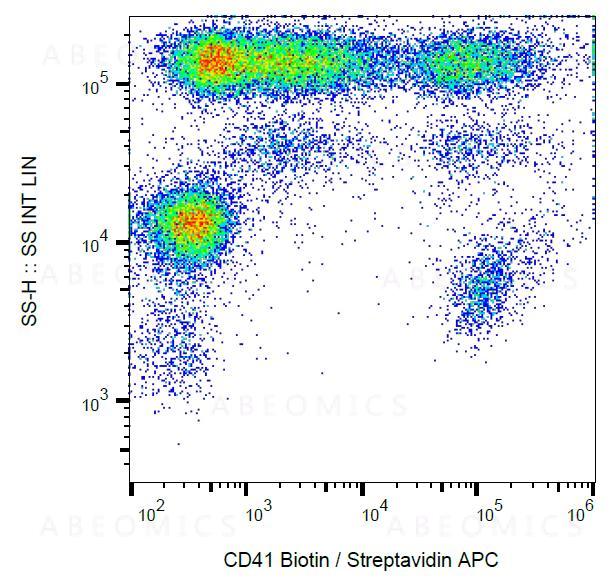 CD41 (platelet glycoprotein IIb) is composed of two subunits (120 kDa a, alpha and 23 kDa b, beta) that interact with CD61 in the presence of calcium to form a functional adhesive protein receptor. Upon blood vessel damage, this receptor binds to a variety of proteins including von Willebrand factor, fibrinogen, fibronectin and vitronectin. CD41 is mainly expressed on megakaryocyte-platelet lineage, but generally belongs to the antigens that are expressed during early stages of hematopoietic differentiation.