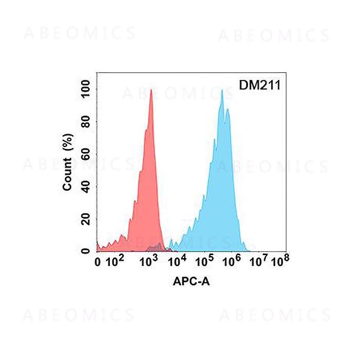 Figure 1. Flow cytometry analysis with Anti-CD43 (DM211) on Expi293 cells transfected with human CD43 (Blue histogram) or Expi293 transfected with irrelevant protein (Red histogram).