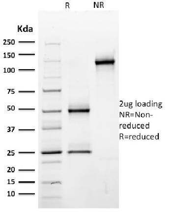 Recognizes a cell surface glycoprotein of 80-95kDa (CD44) on lymphocytes, monocytes, and granulocytes (Leucocyte Typing Workshop V). Its epitope is resistant to digestion by trypsin and chymotrypsin. This MAb selectively interferes with lymphocyte binding to lymph node, mucosal and synovial endothelium. The CD44 family of glycoproteins exists in a number of variant isoforms, the most common being the standard 85-95kDa or hematopoietic variant (CD44s). Higher molecular weight isoforms are described in epithelial cells (CD44v), which are believed to function in intercellular adhesion and stromal binding. CD44 immunostaining is commonly used for the discrimination of urothelial transitional cell carcinoma in-situ from non-neoplastic changes in the urothelium.