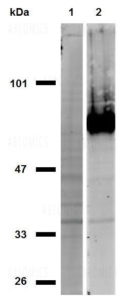 Figure 1: Western blotting analysis of CD44 in HeLa cells (positive; . Lane 2) and MOLT-4 cells (negative; . Lane 1) using anti-CD44 (IM7) purified; non-reducing conditions.
