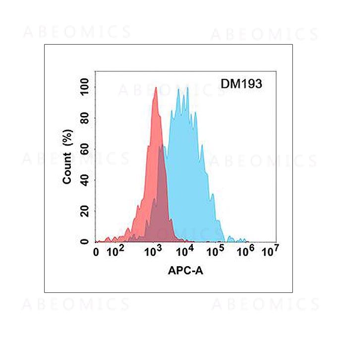 Figure 1. Flow cytometry analysis with Anti-CD45 (DM193) on Expi293 cells transfected with human CD45 (Blue histogram) or Expi293 transfected with irrelevant protein (Red histogram).