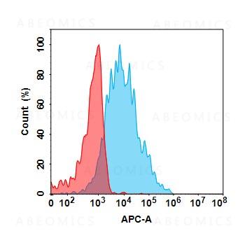 Figure 1. Flow cytometry analysis with 15 μg/mL Anti-CD45 (apamistamab biosimilar) mAb on Expi293 cells transfected with Human CD45 protein (Blue histogram) or Expi293 transfected with irrelevant protein (Red histogram).