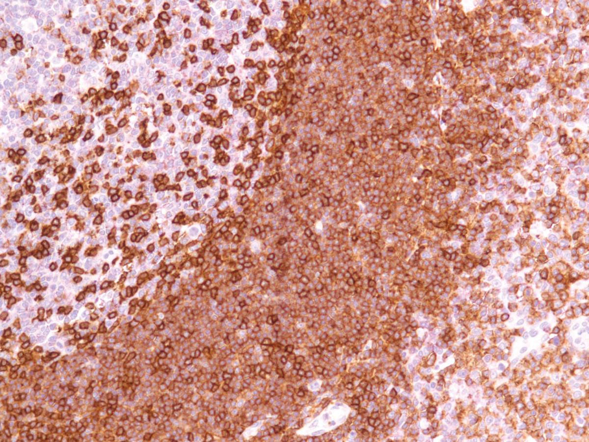 CD45R, also known as MB1, is an isoform of CD45 that is a member of the protein tyrosine phosphatase (PTPase) family. CD45R is expressed specifically on the surface of hematopoietic cells, and has demonstrated function as a regulator of the antigen and cytokine receptor signalling of B and T cells. Given that the antigen is located in the membrane of all B cells, with the exception of plasma cells and some mature T cells, Anti-CD45R exhibits specific reactivity with most B lymphocytes. The use of Anti-CD45R is primarily useful in distinguishing B cell lymphomas from T cell lymphomas, with specific reactivity to follicle center cells, mantle cells, some medullary thymocytes, and 80% of B cell lymphomas.