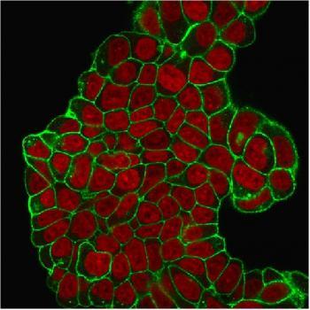 Fig. 1: Immunofluorescent staining of PFA-fixed MCF-7 cells. CD47 Mouse Monoclonal Antibody (B6H12.2) followed by goat anti-Mouse IgG-CF488 (green). Nuclei are stained with Redot (red).