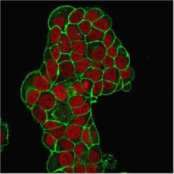 Fig. 1: Immunofluorescence Analysis of PFA-fixed MCF-7 cells. CD47 Mouse Monoclonal Antibody (IAP/964) followed by goat anti-Mouse IgG-CF488 (Green). The nuclear counterstain is Redot.