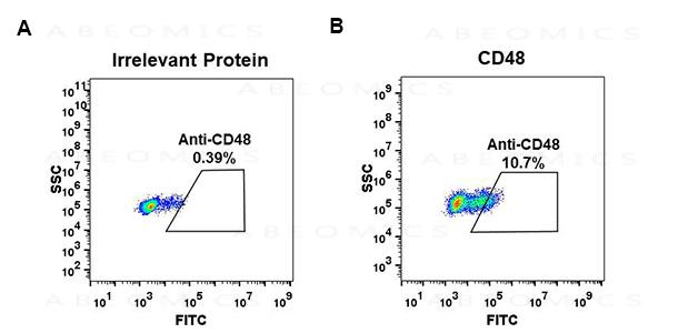 Figure 1. Expi 293 cell line transfected with irrelevant protein (left) and human CD48 (right) were surface stained with Rabbit anti-CD48 monoclonal antibody 1µg/ml (clone: DM44) followed by Alexa 488-conjugated anti-rabbit IgG secondary antibody.