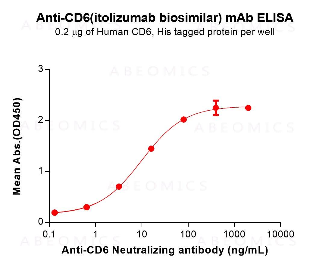 Figure 1. ELISA plate pre-coated by 2 μg/mL (100 μL/well) Human CD6 Protein, His Tag can bind Anti-CD6(itolizumab biosimilar) mAb (12-90006) in a linear range of 0.64–80 ng/mL.