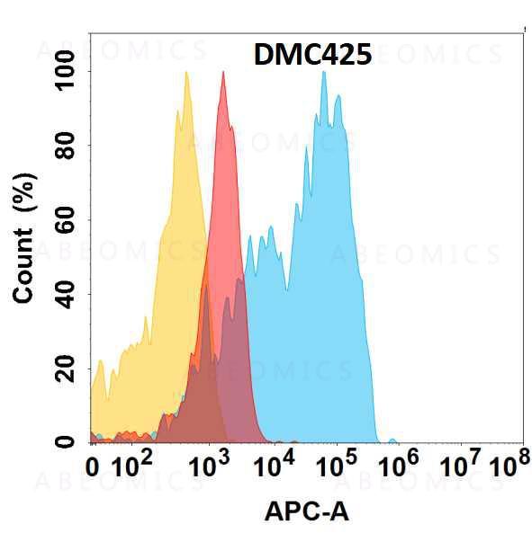 Figure 1. CD63 protein is highly expressed on the surface of Expi293 cell membrane. Flow cytometry analysis with Anti-CD63 (DMC425) on Expi293 cells transfected with human CD63 (Blue histogram) or Expi293 transfected with irrelevant protein (Red histogram), and Isotype antibody on Expi293 transfected with irrelevant protein (Orange histogram).