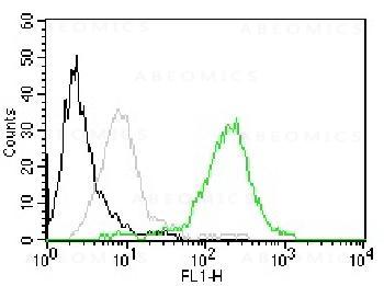 Fig. 1: Flow Cytometry of human CD63 on MCF-7 cells. Black: cells alone; Grey: Isotype Control; Green: CF488-labeled CD63 Monoclonal Antibody (MX-49.129.5).
