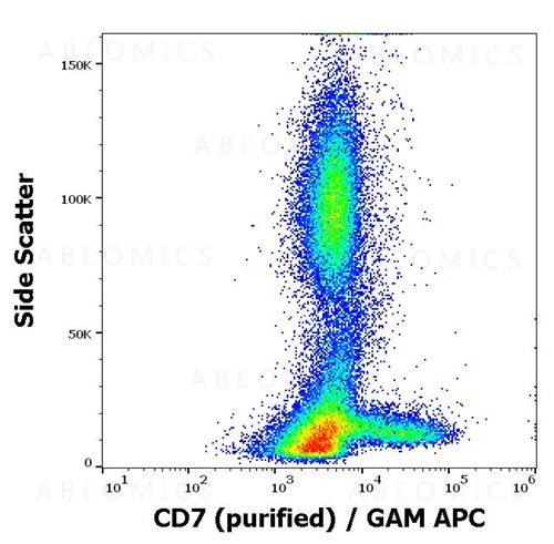 CD7, also known as gp40, is a member of the immunoglobulin superfamily found on T cells, NK cells, thymocytes, hematopoietic progenitors, and monocytes (weakly). CD7 is also expressed on acute lymphocytic leukemia (ALL). CD7 crosslinking induces a calcium flux in T lymphocytes, presumably as a result of cytoplasmic domain association with PI3-kinase. CD7 co-stimulation can induce cytokine secretion and modulate cellular adhesion. A ligand of CD7, epithelial cell secreted protein K12, is produced in thymus to regulate thymocyte signaling and cytokine release. In lung microvascular endothelial cells CD7 serves as an IgM Fc receptor. Expression of CD7 is an important marker used in leukemia diagnostics.