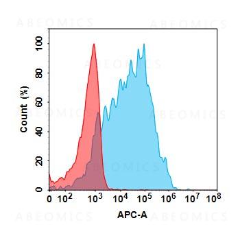 Figure 1. Flow cytometry analysis with 1μg/mL Anti-CD70 (Chongqing Precision biosimilar) mAb on Expi293 cells transfected with Human CD70 protein (Blue histogram) or Expi293 transfected with irrelevant protein (Red histogram).