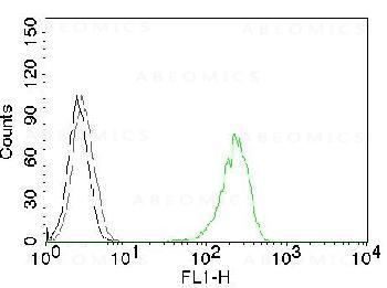 Fig. 1: Flow Cytometry of human CD71 on K562 cells. Black: cells alone; Grey: Isotype Control; Green: CF488-labeled CD71 Monoclonal Antibody (66IG10).