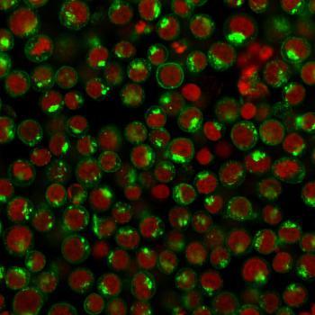Fig. 1: Immunofluorescence Analysis of Human Jurkat cells labeling CD71 with CD71 Mouse Monoclonal antibody (DF1513) followed by Goat anti-Mouse IgG-CF488 (Green). The nuclear counterstain is Reddot (Red)