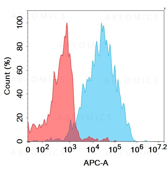 Figure 1. Flow cytometry analysis with 10μg/mL Anti-CD72 (1E9) mAb on Expi293 cells transfected with human CD72 (Blue histogram) or Expi293 transfected with irrelevant protein (Red histogram).