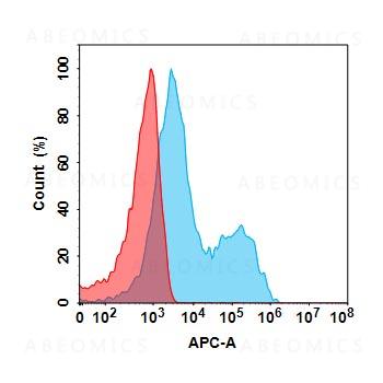 Figure 1. Flow cytometry analysis with 15μg/mL Anti-CD79b(polatuzumab biosimilar) mAb on Expi293 cells transfected with Human CD79b protein (Blue histogram) or Expi293 transfected with irrelevant protein (Red histogram).