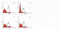 Figure 1: Induction of apoptosis in various hematopoetic cell lines by use of anti-Fas antibodies.Suspensions of used cell lines were incubated with soluble (or without as control) anti-Fas antibodies. Induction of apoptosis was measured by Apoptosis Assay Kit - FITC.Histograms:Red (full) - untreated control cellsBlack - standard apoptosis-inducing anti-Fas antibodyGreen - anti-Fas (UT-1)A - JURKAT human peripheral blood T cell leukemia cell lineB - TF-1 human bone marrow erythroleukemia cell lineC - CEM human leukemia cell lineD - MOLT-4 human acute lymphoblastic T cell leukemia cell line