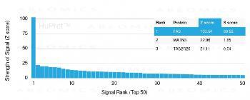 Fig. 1: Analysis of Protein Array containing more than 19,000 full-length human proteins using CD95 Mouse Monoclonal Antibody (FAS/3588). Z- and S- Score: The Z-score represents the strength of a signal that a monoclonal antibody (Monoclonal Antibody) (in combination with a fluorescently-tagged anti-IgG secondary antibody) produces when binding to a particular protein on the HuProtTM array. Z-scores are described in units of standard deviations (SD’s) above the mean value of all signals generated on that array. If targets on HuProtTM are arranged in descending order of the Z-score, the S-score is the difference (also in units of SD’s) between the Z-score. S-score therefore represents the relative target specificity of a Monoclonal Antibody to its intended target. A Monoclonal Antibody is considered to specific to its intended target, if the Monoclonal Antibody has an S-score of at least 2.5. For example, if a Monoclonal Antibody binds to protein X with a Z-score of 43 and to protein Y with a Z-score of 14, then the S-score for the binding of that Monoclonal Antibody to protein X is equal to 29.