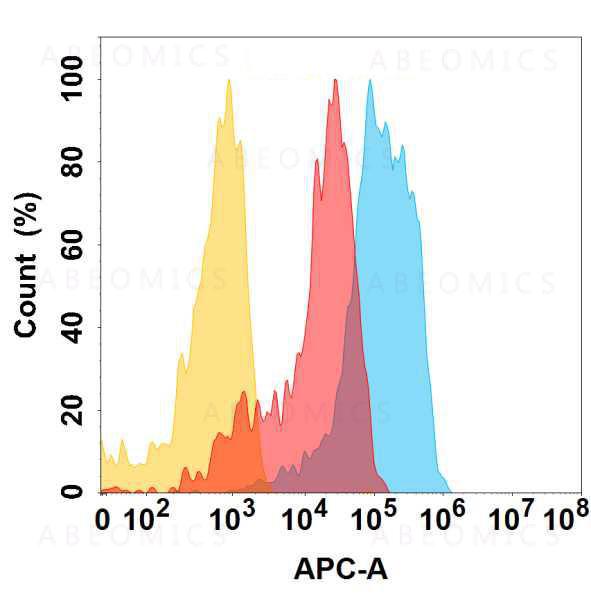 Figure 1. CD98 protein is expressed on the surface of Expi293 cell membrane. Flow cytometry analysis with Anti-CD98 (2H8) mAb on Expi293 cells transfected with human CD98 (Blue histogram) or Expi293 transfected with irrelevant protein (Red histogram), and Isotype antibody on Expi293 transfected with irrelevant protein (Orange histogram).