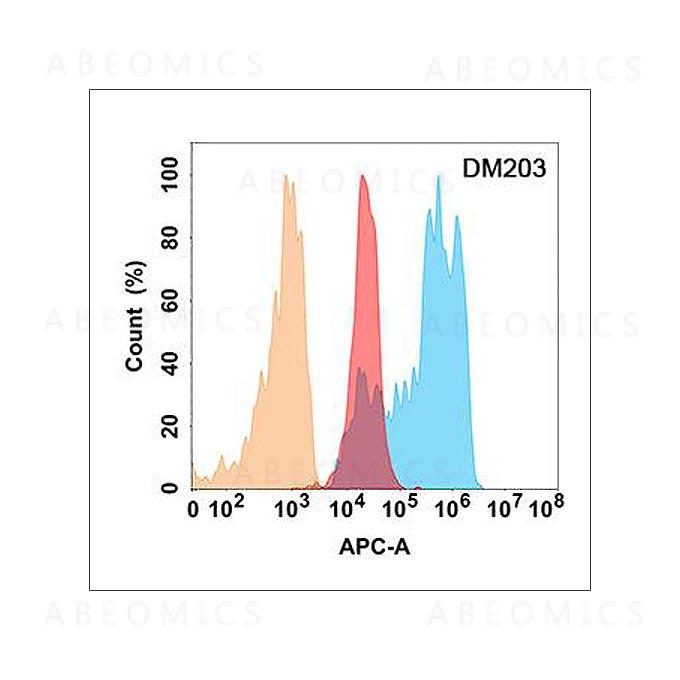 Figure 1. CD99 protein is highly expressed on the surface of Expi293 cell membrane. Flow cytometry analysis with Anti-CD99 (DM203) on Expi293 cells transfected with human CD99 (Blue histogram) or Expi293 transfected with irrelevant protein (Red histogram), and Isotype antibody on Expi293 transfected with irrelevant protein (Orange histogram).