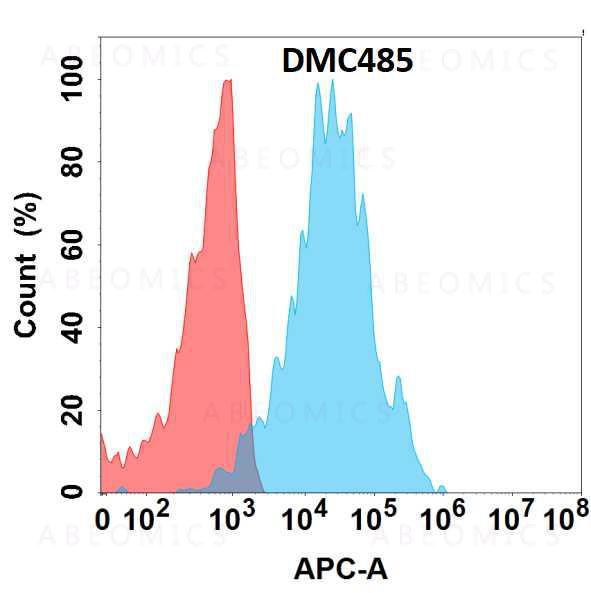 Figure 1. Flow cytometry analysis with Anti-CDH17 (DMC485) on Expi293 cells transfected with human CDH17 (Blue histogram) or Expi293 transfected with irrelevant protein (Red histogram).