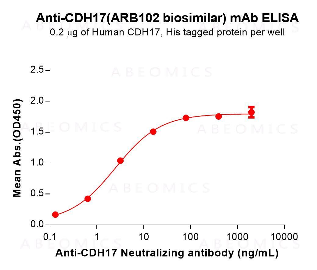 Figure 1. ELISA plate pre-coated by 2 ug/mL (100 ul/well) Human CDH17 Protein, His Tag can bind Anti-CDH17(ARB102 biosimilar) mAb in a linear range of 0.64-16 ng/mL.