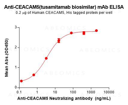 Figure 1. ELISA plate pre-coated by 2 μg/mL (100 μL/well) Human CEACAM5 Protein, His Tag can bind Anti-CEACAM5(tusamitamab biosimilar) mAb in a linear range of 0.64-16 ng/mL.
