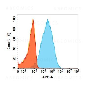 Figure 1. Flow cytometry analysis with 1μg/mL Anti-CGRPR(Erenumab biosimilar) mAb on Expi293 cells transfected with Human CGRPR&RAMP1 protein (Blue histogram) and Expi293 transfected with Human CGRPR protein (Red histogram) ) or Human RAMP1 protein(Orange histogram).