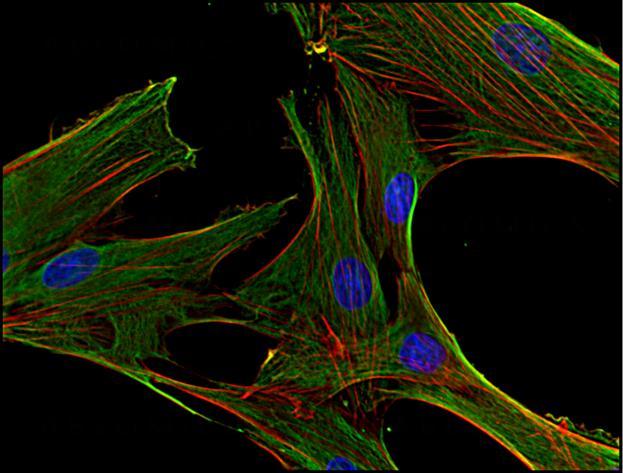 Figure 1: Immunofluorescence staining of clathrin in human primary fibroblasts using anti-clathrin (BF-06; green). Actin cytoskeleton decorated by phalloidin (red) and cell nuclei stained with DAPI (blue).