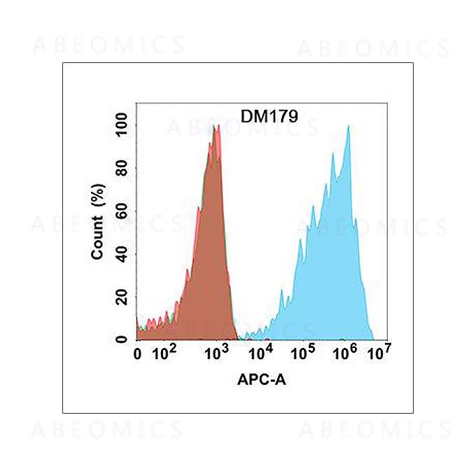 Figure 1. Flow cytometry analysis with Anti-CLDN18.2 (DM179) on Expi293 cells transfected with human CLDN18.2 (Blue histogram)or Expi293 transfected with human CLDN18.1 (Green histogram)or Expi293 transfected with irrelevant protein (Red histogram).