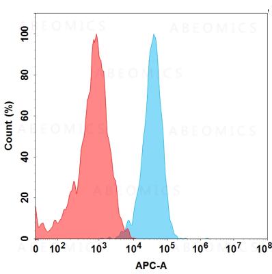 Figure 1. Flow cytometry analysis with 1 μg/mL Anti-CLDN6 (IMAB027) mAb on Expi293 cells transfected with Human CLDN6 protein (Blue histogram) or Expi293 transfected with irrelevant protein (Red histogram).