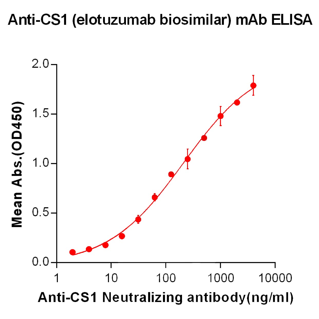Figure 1. ELISA plate pre-coated by 2 μg/ml (100 μL/well) Human CS1, hFc-His tagged protein can bind Anti-CS1 Neutralizing antibody in a linear range of 7.81-210.7 ng/ml.