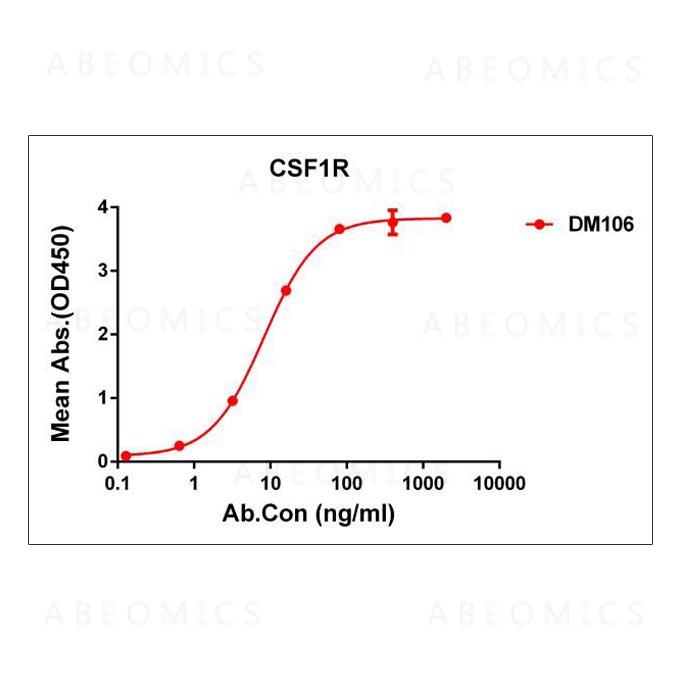 Figure 1. ELISA plate pre-coated by 2 μg/ml (100 μl/well) Human CSF1R protein,His tagged protein can bind Rabbit anti-CSF1R monoclonal antibody (clone: DM106) in a linear range of 0.6-60 ng/ml.