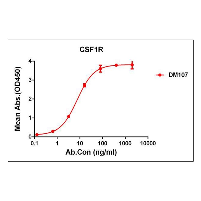 Figure 1. ELISA plate pre-coated by 2 μg/ml (100 μl/well) Human CSF1R protein,His tagged protein can bind Rabbit anti- CSF1R monoclonal antibody (clone: DM107) in a linear range of 0.6-40 ng/ml.